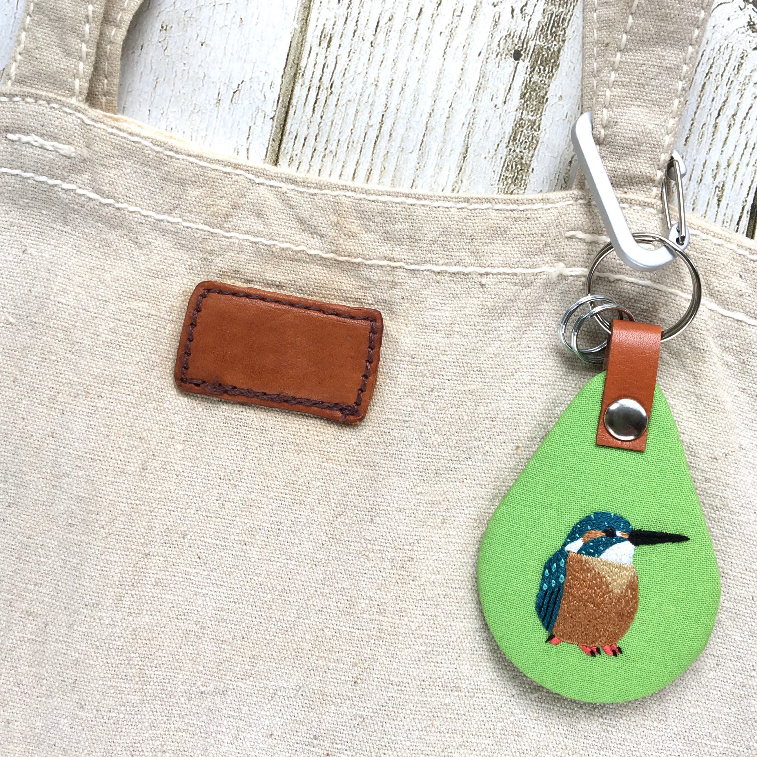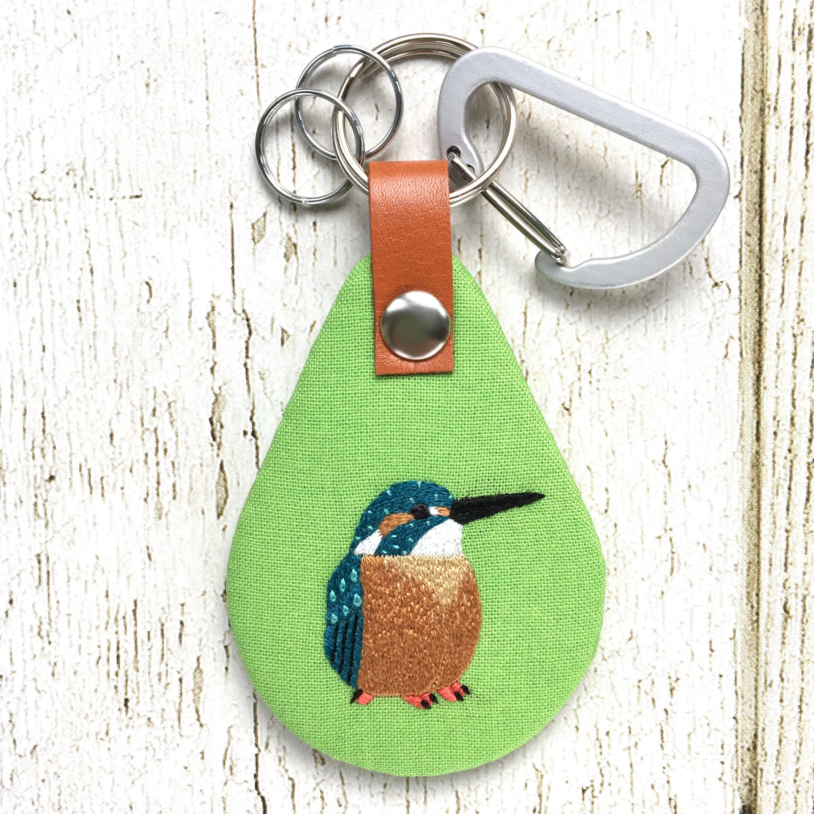 宝石のような青い体の色がとても美しい人気の野鳥、カワセミ(男の子/クチバシの色が黒色なのが男の子の特徴です)を手刺繍したキーホルダーです。川辺に揺れる野草をイメージしたライトグリーンのコットン生地に刺繍しました。