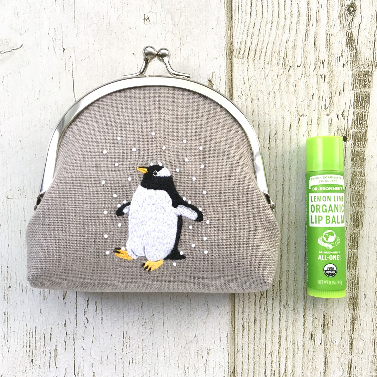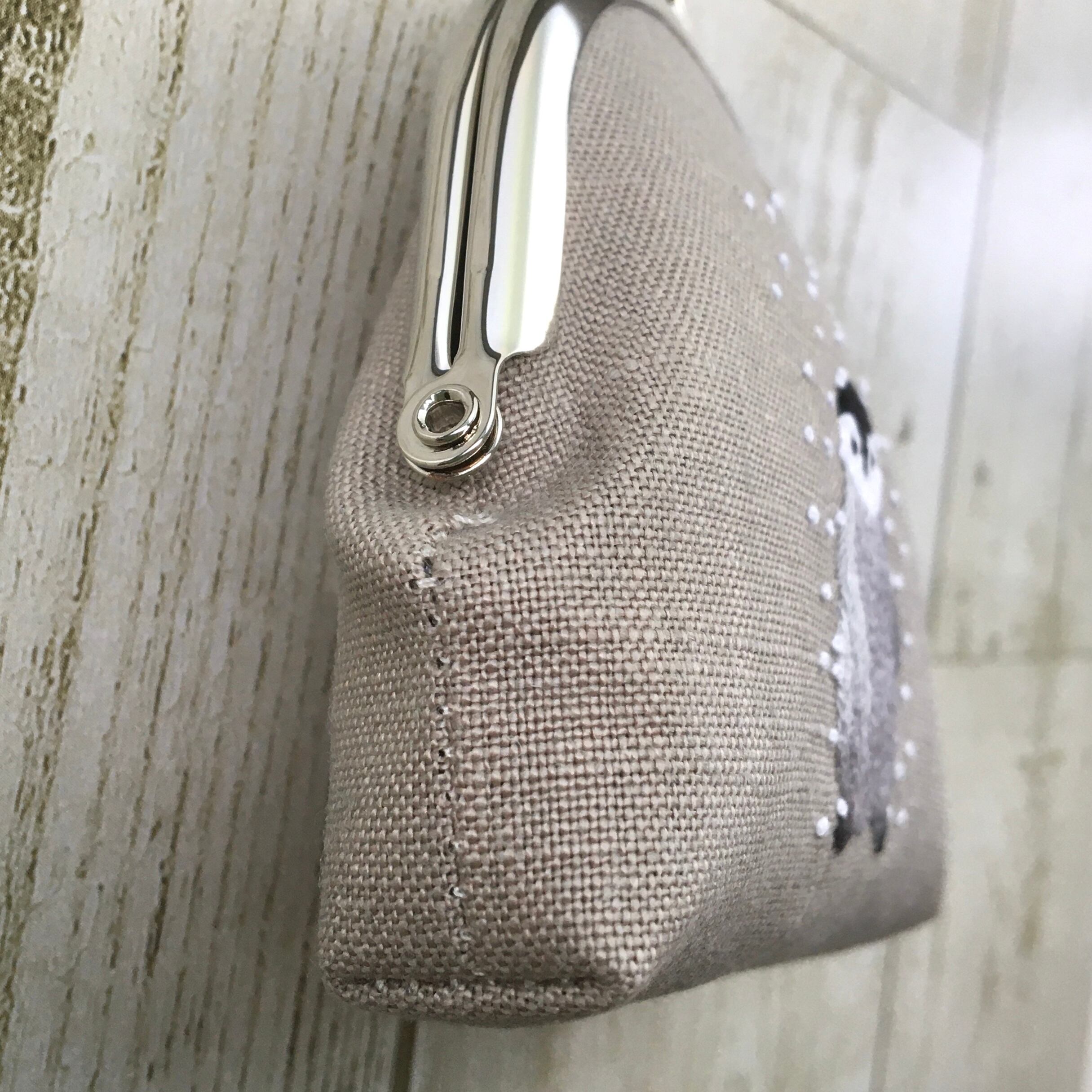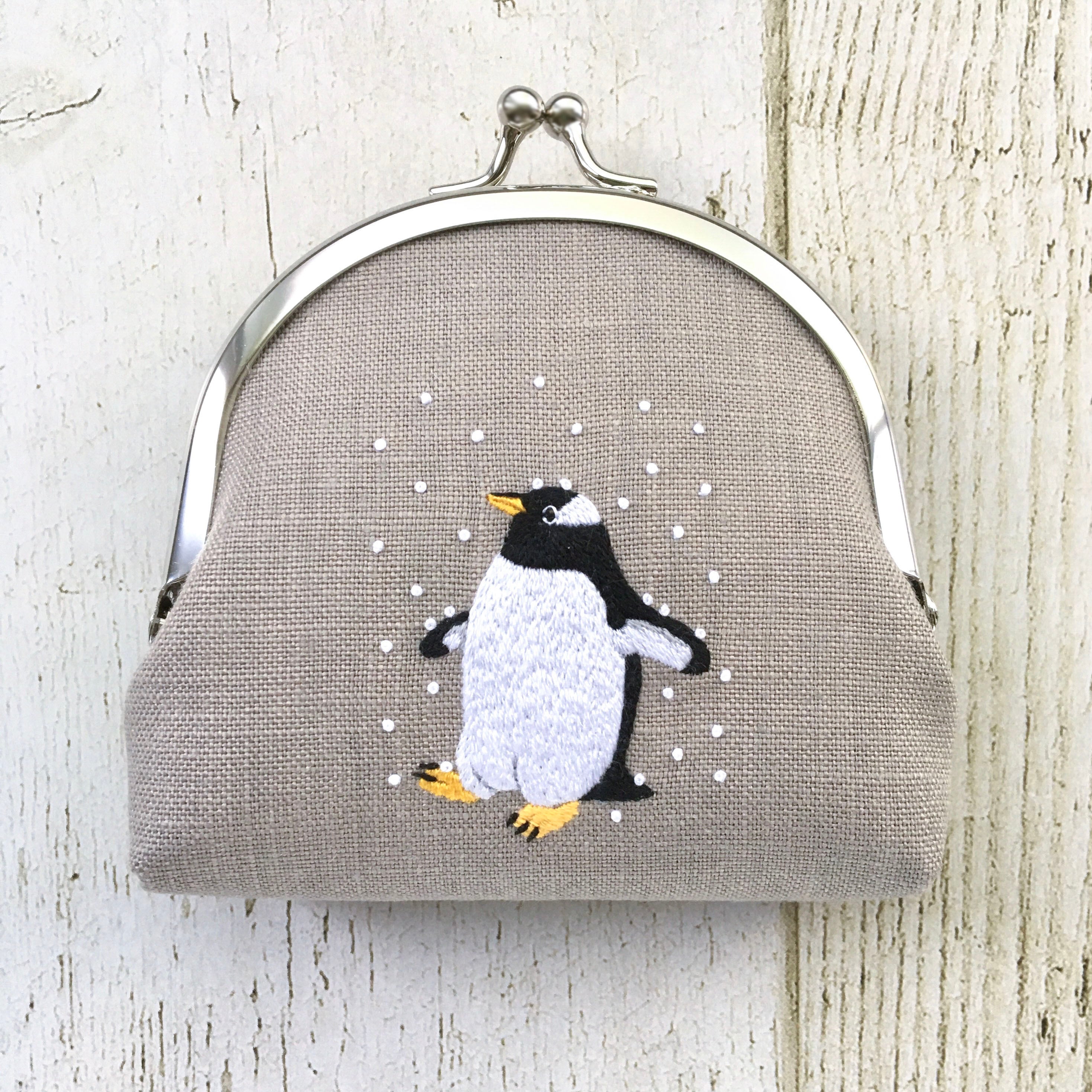 しんしんと降り積もる雪の中で佇むジェンツーペンギンの刺繍がま口ポーチです。生息地の風景を感じさせるライトグレーのリネン生地でペンギンたちの暮らしが思い浮かぶような素敵なアイテムになりました。