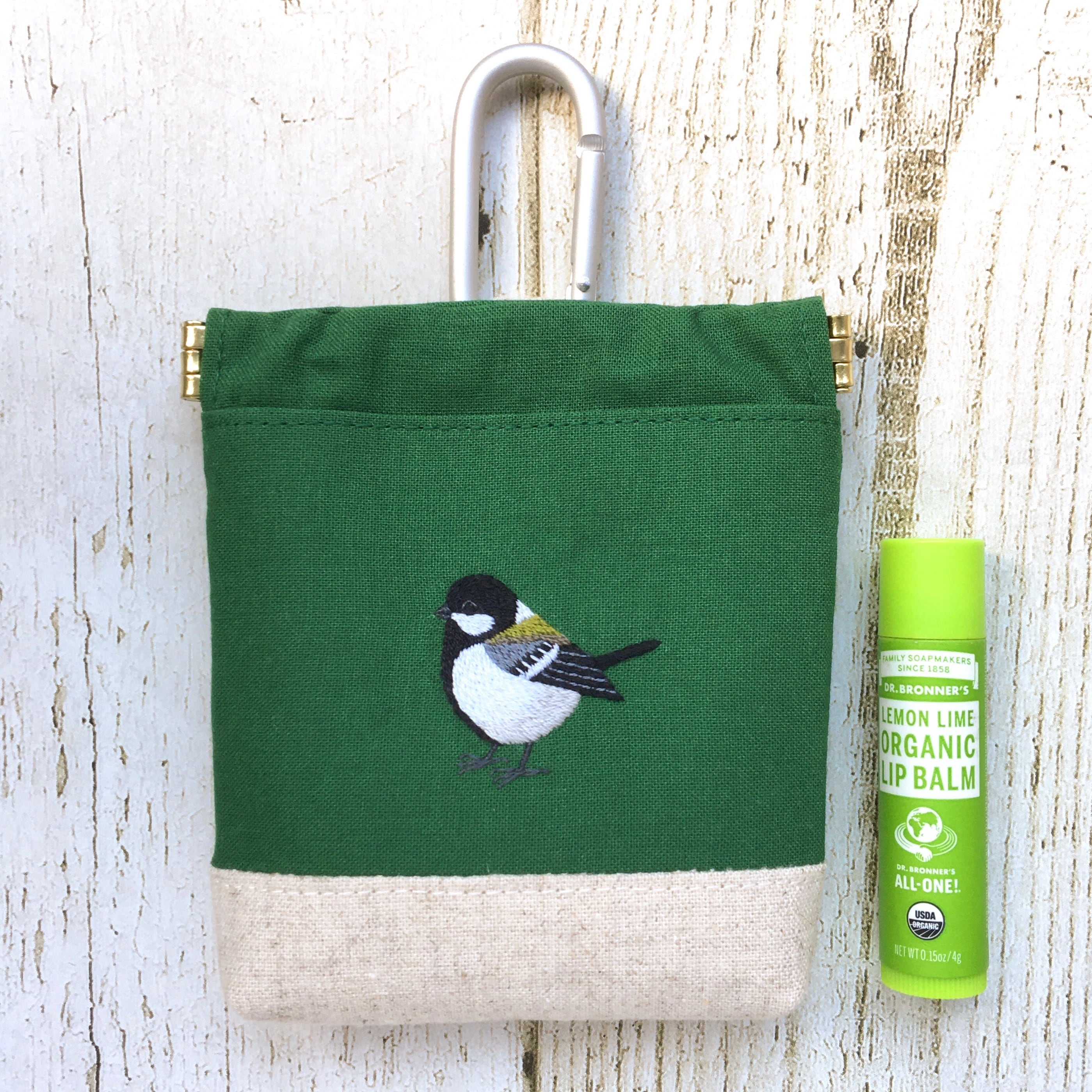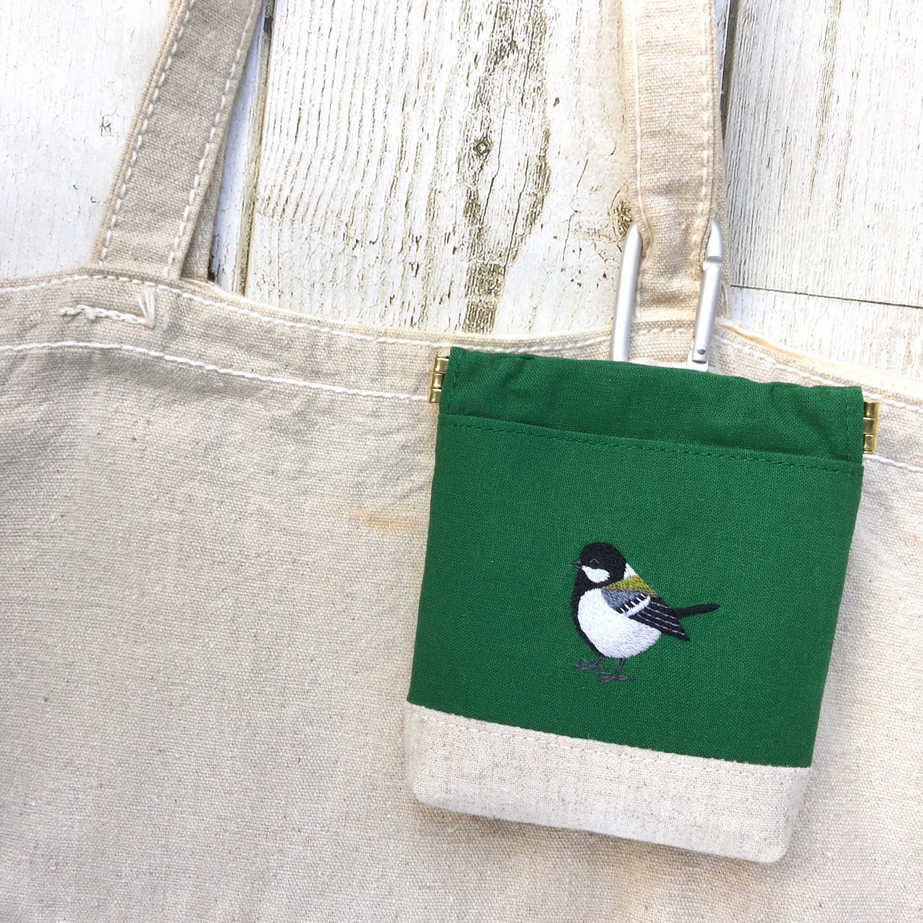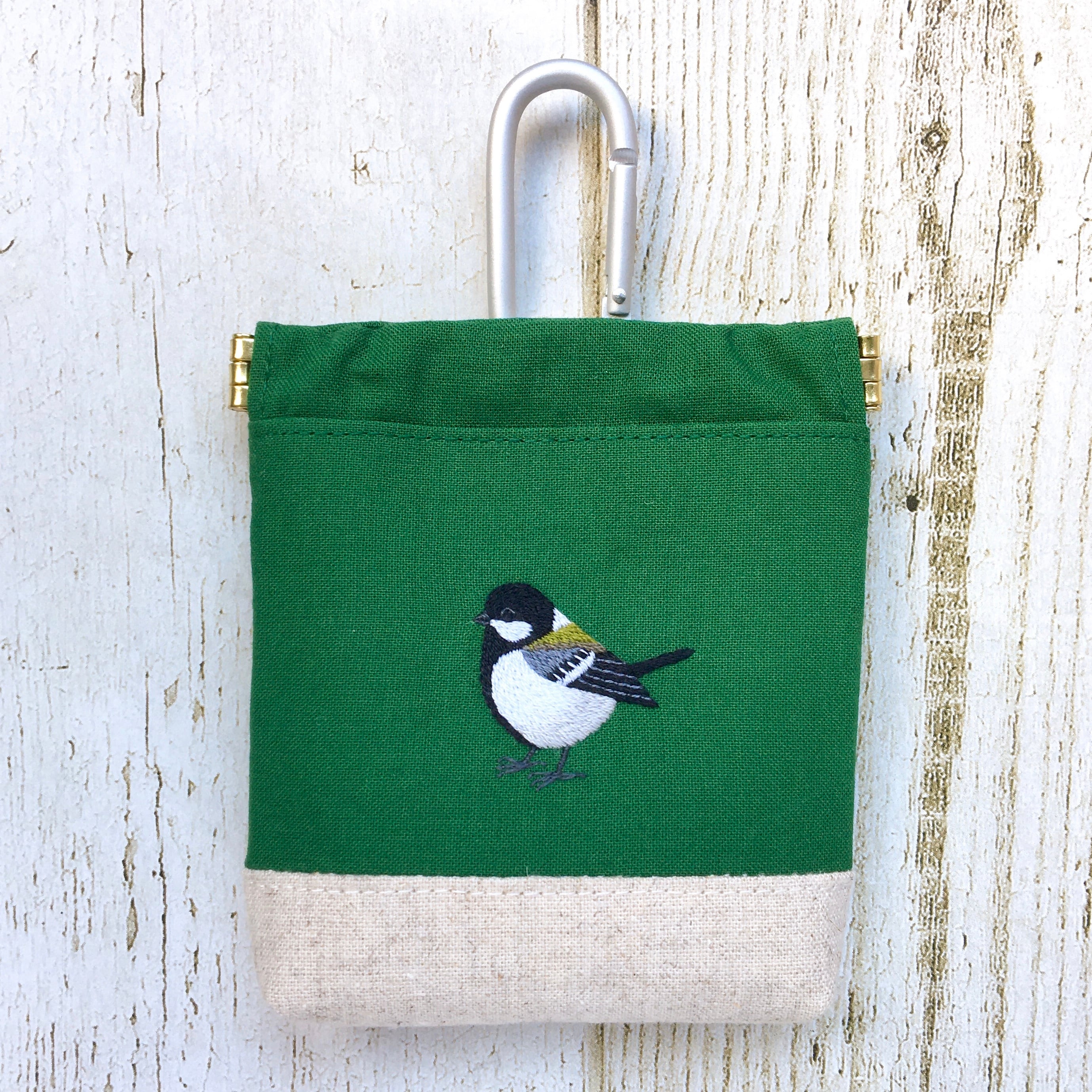 緑色の背中が美しく、仲間同士で会話をしているという研究が話題にもなった身近な野鳥シジュウカラをワンポイント刺繍したバネ口のポーチです。