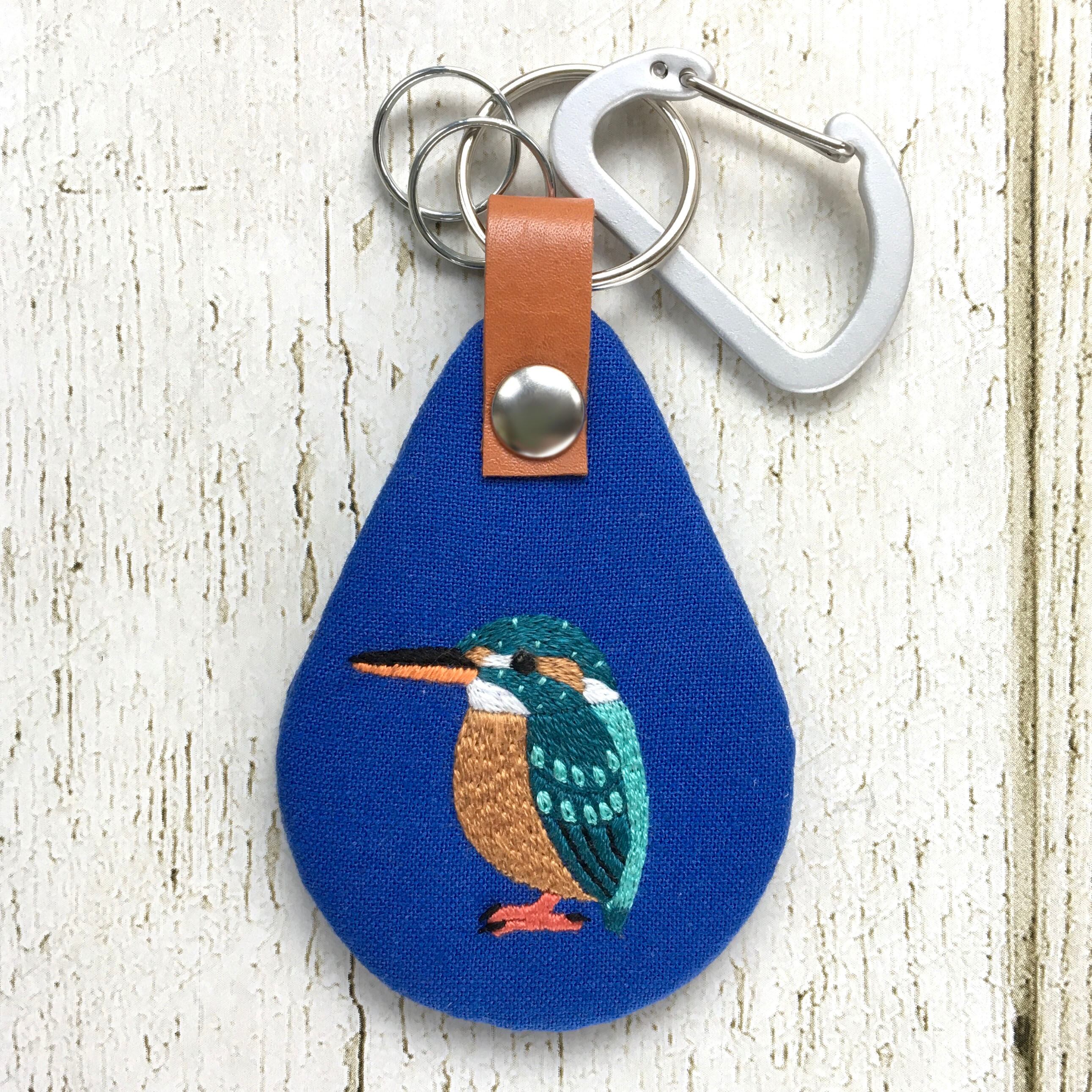 宝石のような青い体の色がとても美しい人気の野鳥、カワセミ(女の子/クチバシの下がオレンジ色なのが女の子の特徴です)を手刺繍したキーホルダーです。清らかな川の水をイメージしたブルーのコットン生地に刺繍しました。